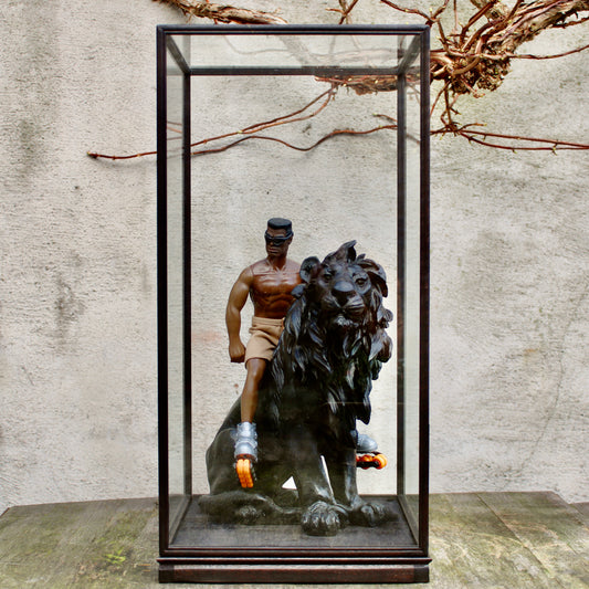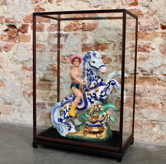 Werk 01. KEVIN met paard in vitrinekast 40,5X23X58cm