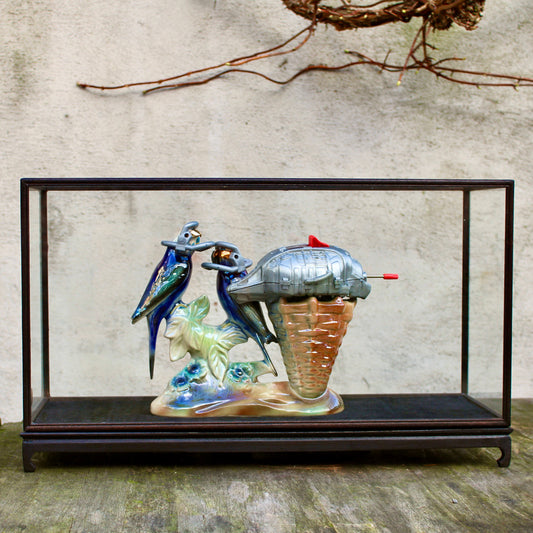 Werk 06. Space parrots in vitrinekastje 53X18X31,5cm